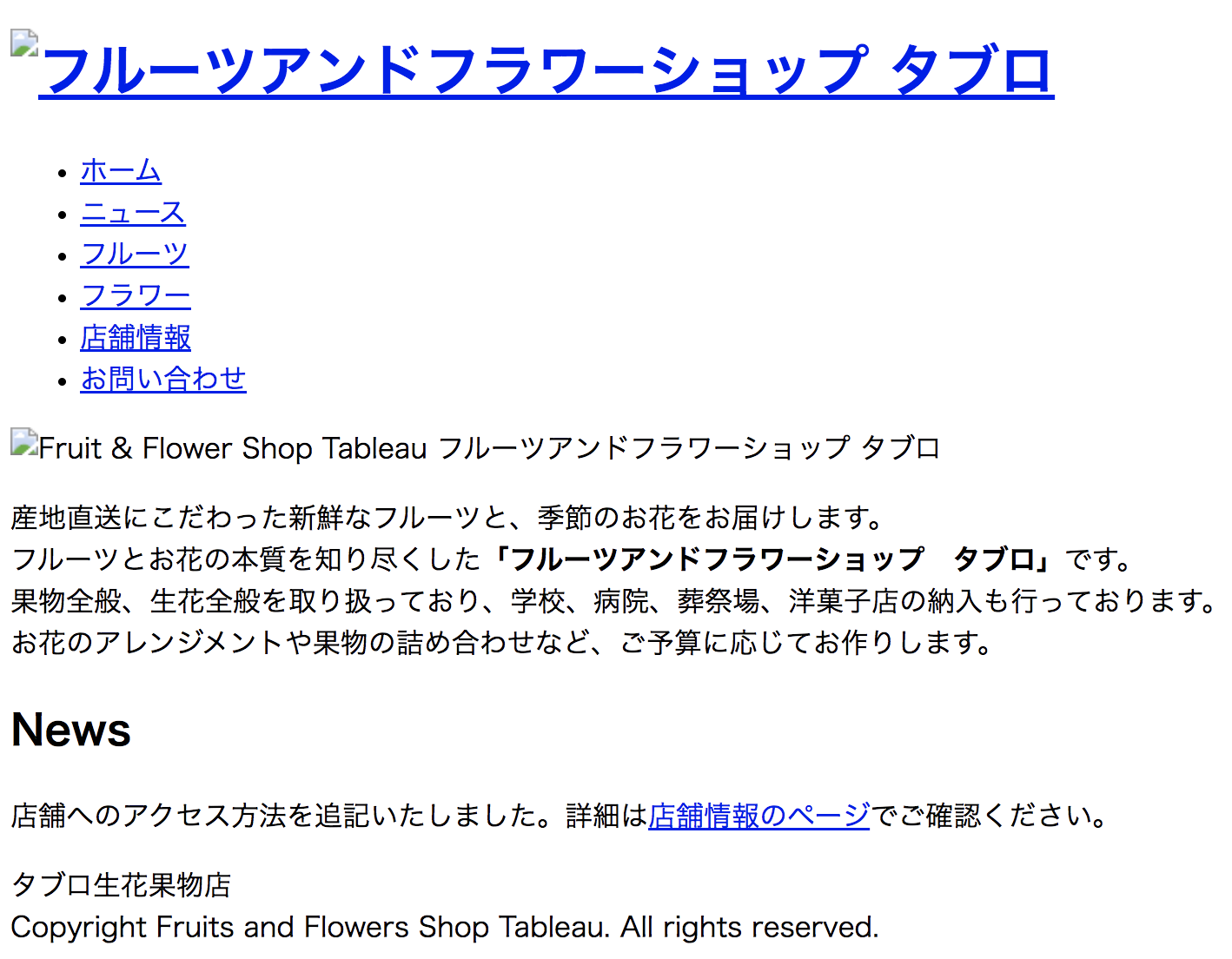 <!--フッターここから--> <p class="footer"> タブロ生花果物店<br> Copyright Fruits and Flowers Shop Tableau. All rights reserved. </p> <!--フッターここまで--> </div> <!-- .containerここまで --> <?php wp_footer(); ?> </body> </html>